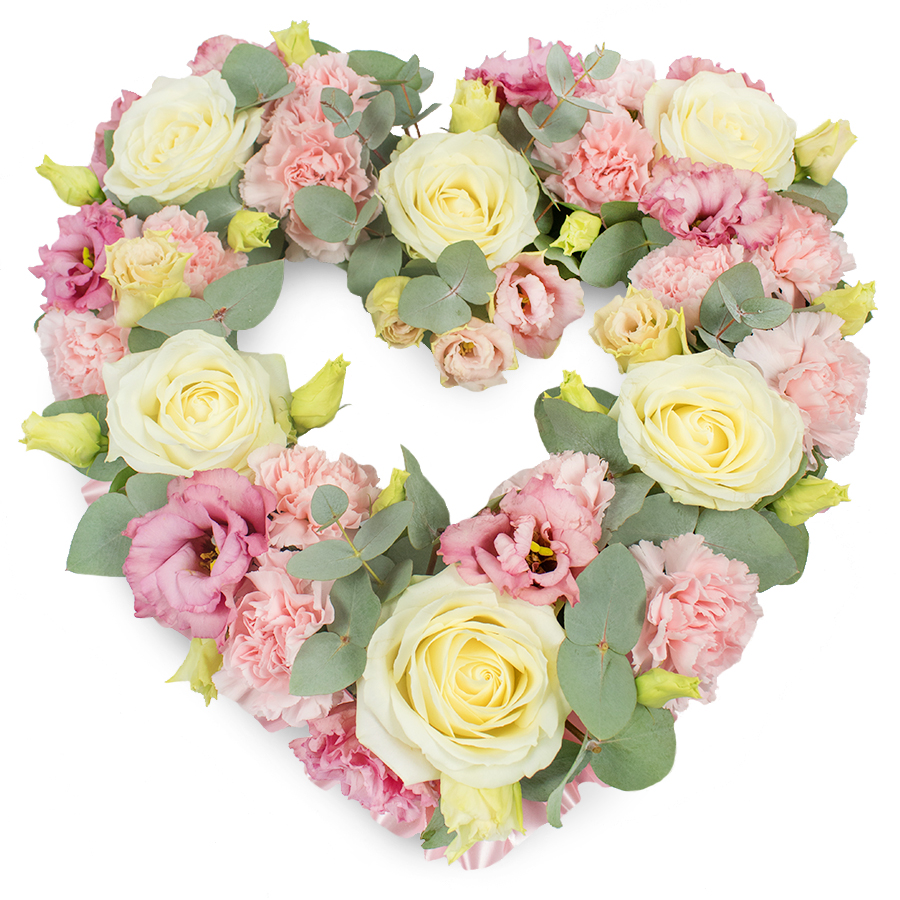 Illuminate your sentiments with our Enchanting White & Pink Heart Bouquet, a mesmerizing arrangement of white roses, pink carnations, pink lisianthus, and fragrant eucalyptus.Features to Love: